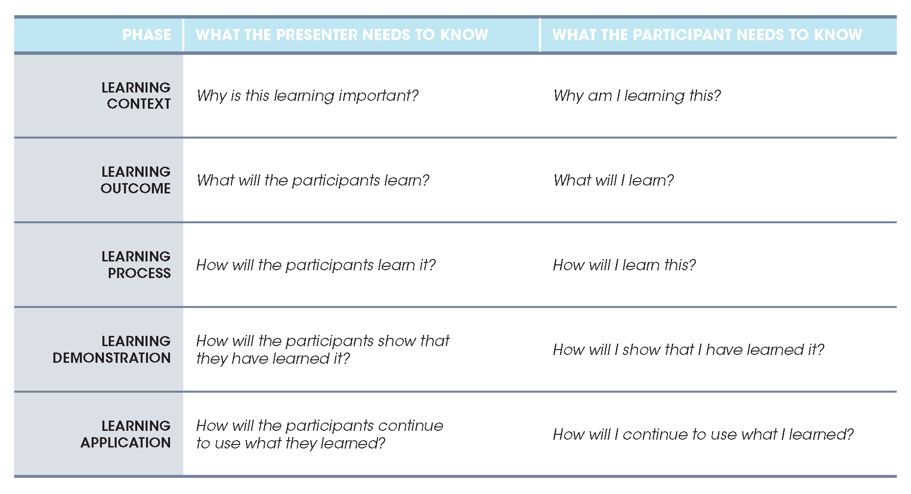 This clarity of decision-making will allow your participants to understand their role in their own learning. That is, if you let them in on your decision-making. Thus, throughout the session, share with your participants your plan and help them to answer the following questions: