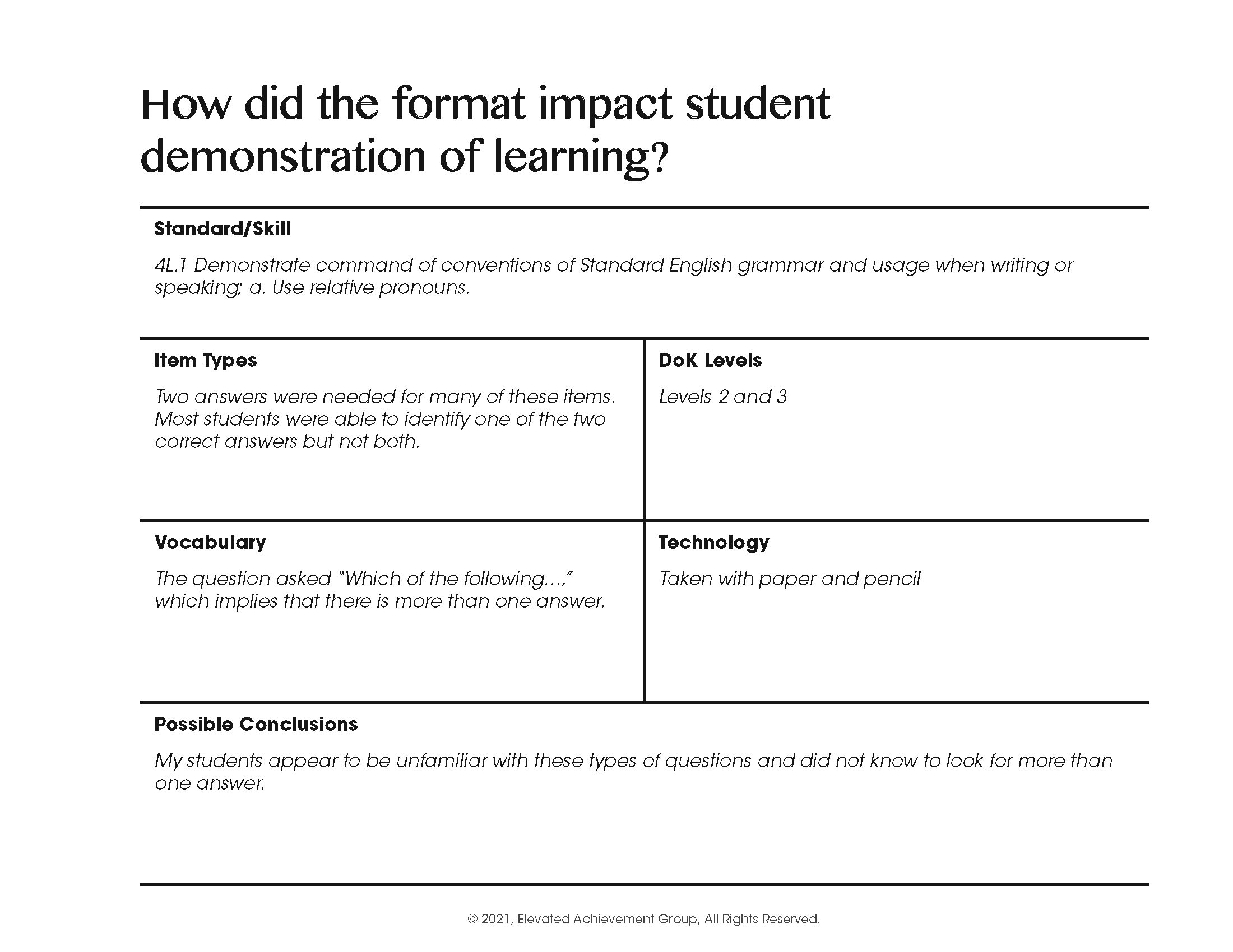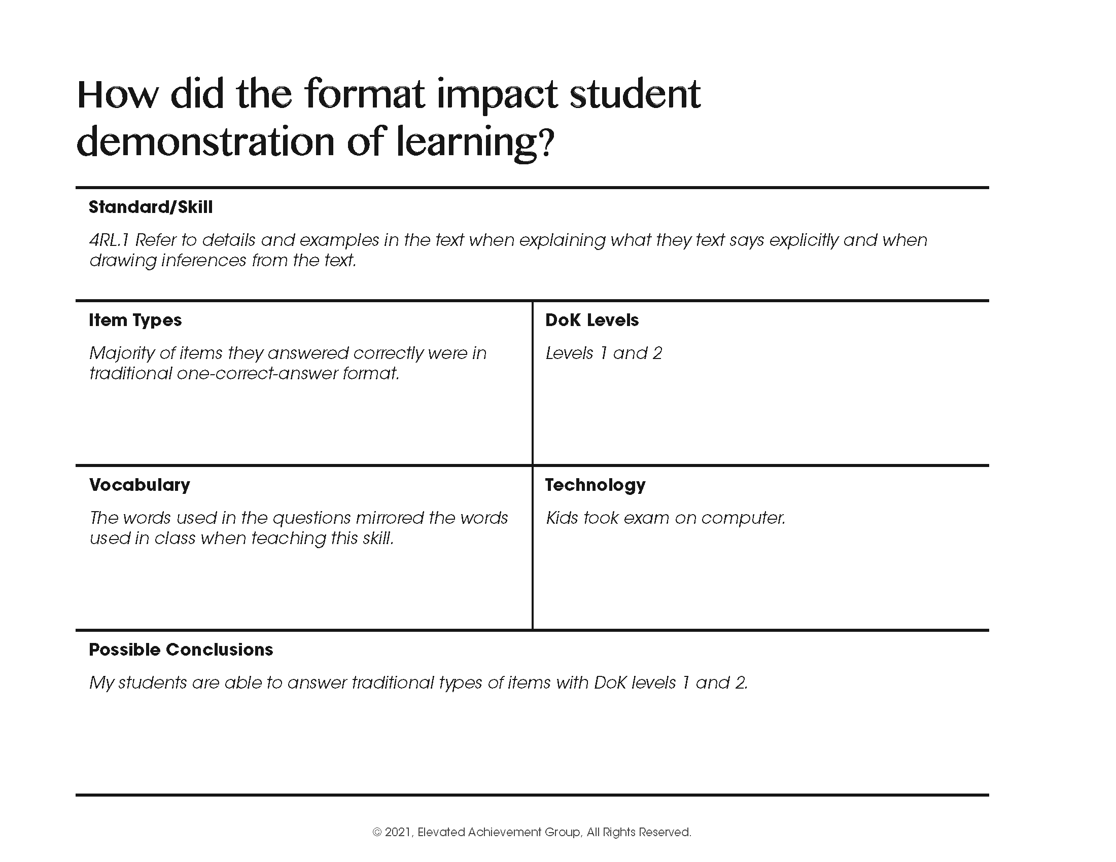 In other words, were your students completely aware of the format of the assessment, each item type and what it was asking the students to demonstrate, and the cumulative effect of this assessment on their learning? When reflecting on the format, remind yourself of the skill being assessed, the type of item, the Depth of Knowledge level, the vocabulary and technology used, and the possible impact each of these had on student results.