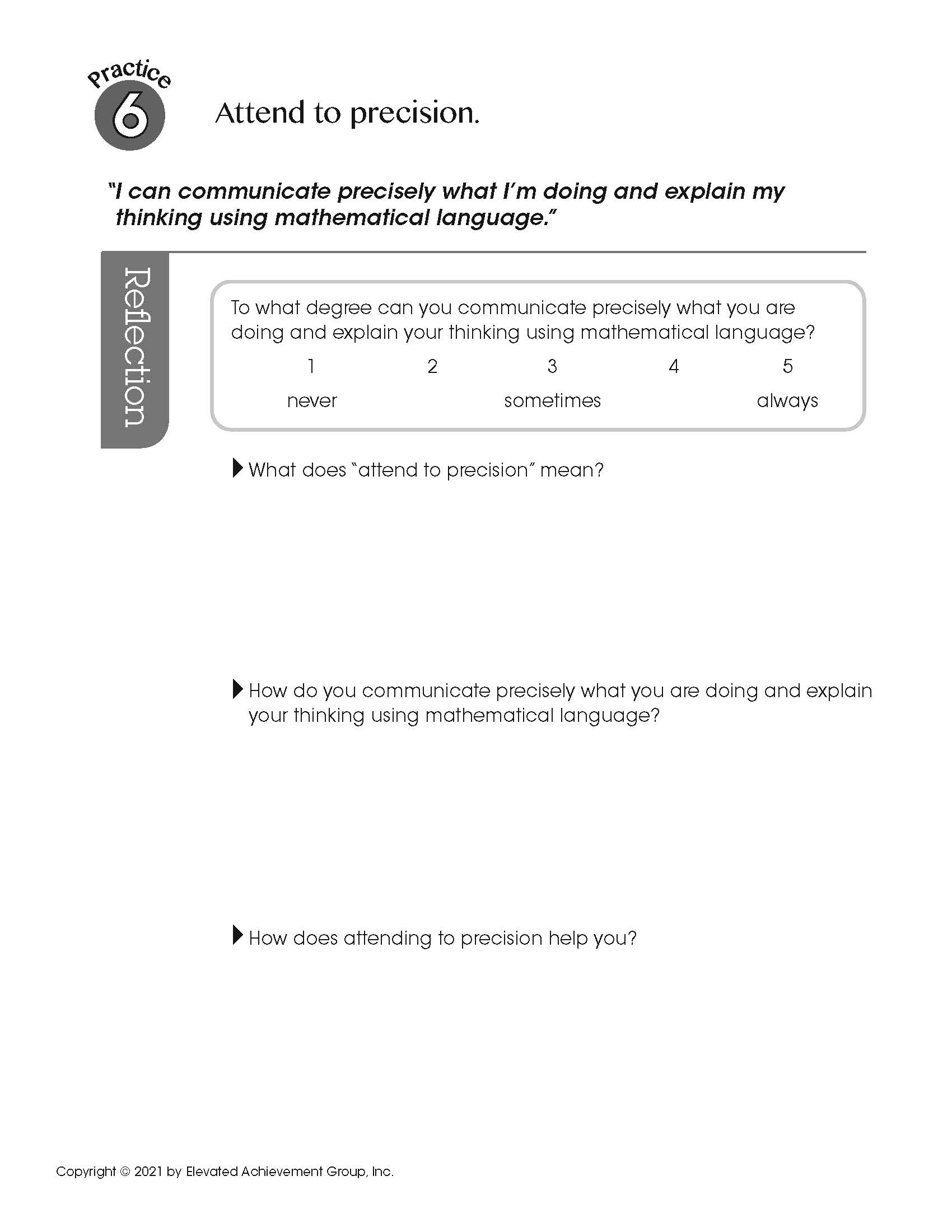 - A reflection guide to support students as they “think about their thinking” around Mathematical Practice Standard 6.