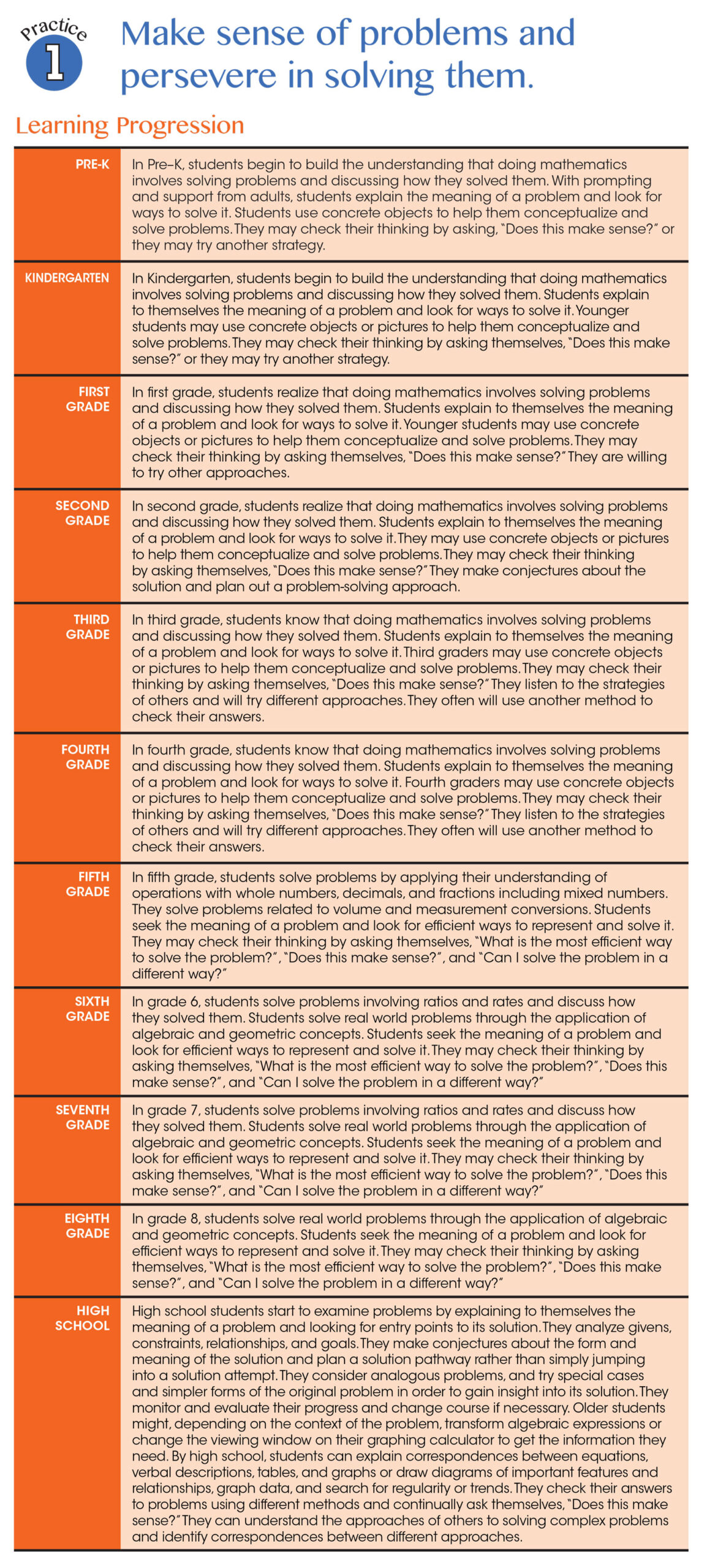Because the 8 Standards for Mathematical Practice are the same for all grade levels, they are not specific enough to provide much practical guidance for classroom implementation. So, we’ve provided the standard and its learning progression for every grade from Pre-K through High School to better understand how the thinking builds in tandem with students’ cognitive development and the demands of mathematical content, as shown in the example below.